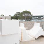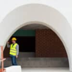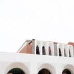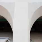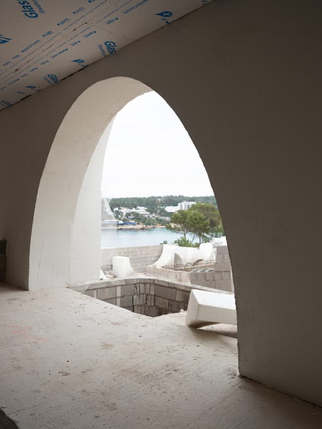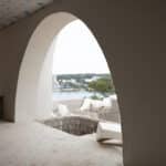 Diseño e instalación de arcos abovedados con jardineras superiores en el hotel Nomade Temple Ibiza, utilizando ingeniería de porex para ofrecer una construcción rápida y eficiente.